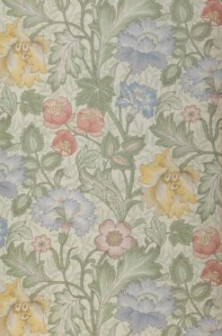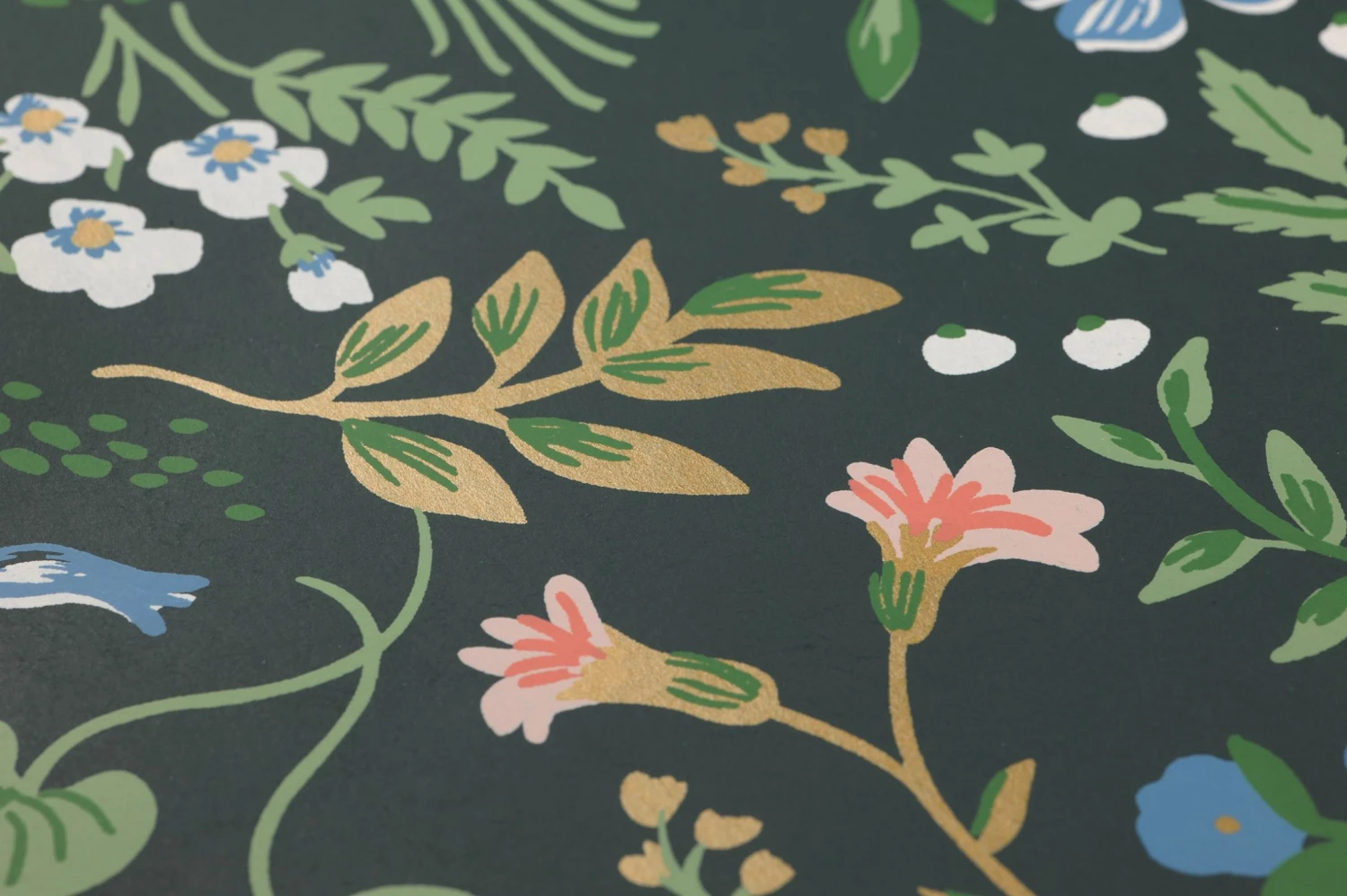 Durch den tannengrünen Untergrund der Vliestapete wirken die Blumen in ihren hellen, freundlichen Farben mit goldfarbenen Details wie Frühlingsblumen auf weichem, moosigem Waldboden. Die Darstellung der Blüten und Blätter erinnert an Ornamente aus der Bauernmalerei, wirkt aber gleichzeitig durch die willkürlich anmutende Verteilung wie natürlich gewachsen. Die Tapete harmoniert ideal mit einer Vielzahl von Möbelstilen.